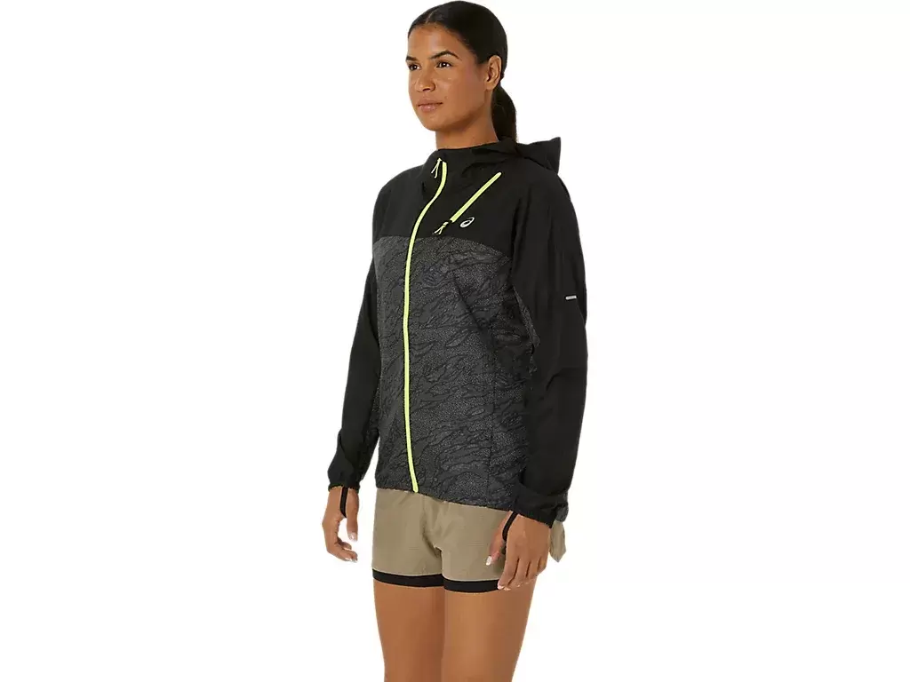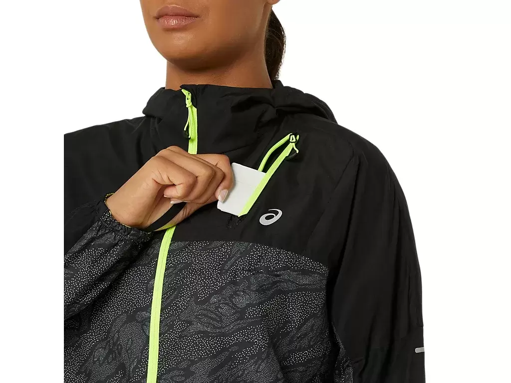 Jakken har et heldekkende trykkmønster og kan enkelt tas av og pakkes i brystlommen under løpeturen.