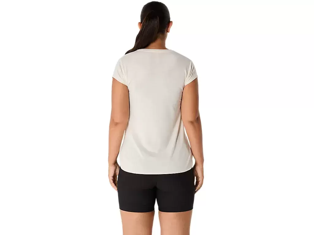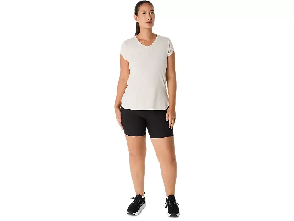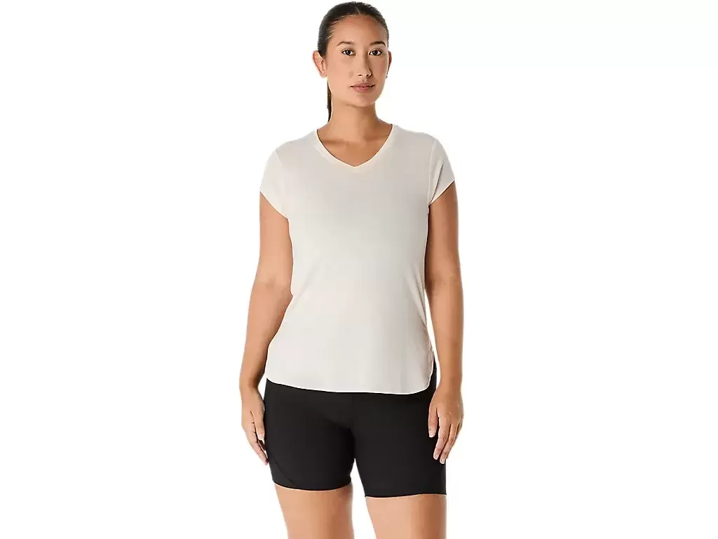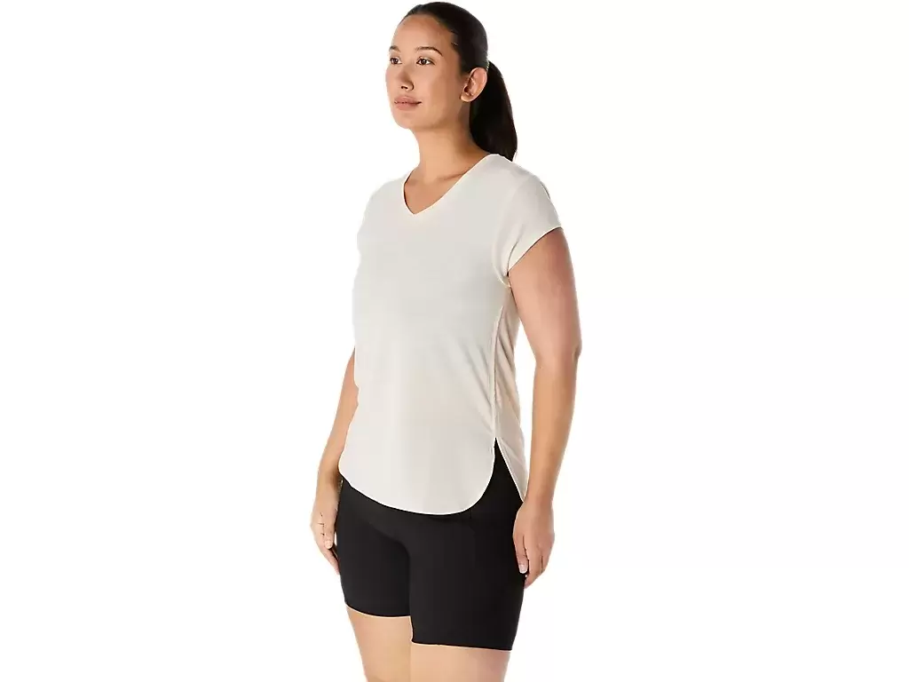 Denne kortermede toppen med V-hals er designet for å gi en elegant følelse mot huden. Den er laget av et komfortabelt strikkestoff som er kombinert med sidesømmer fremover for å forbedre bevegelsesfriheten.