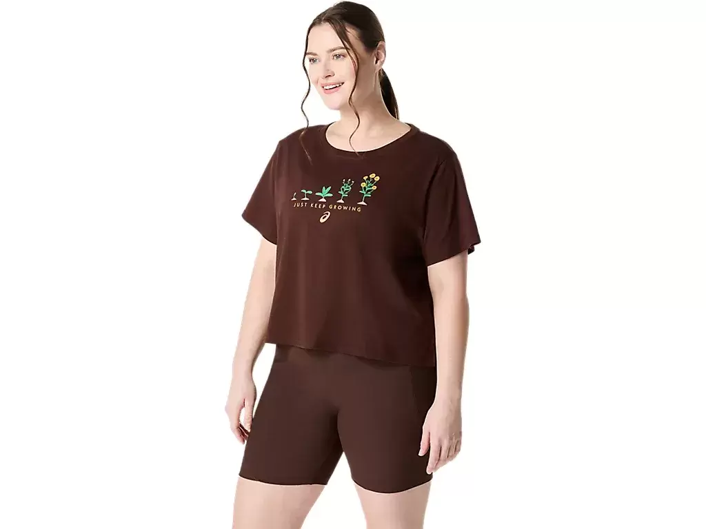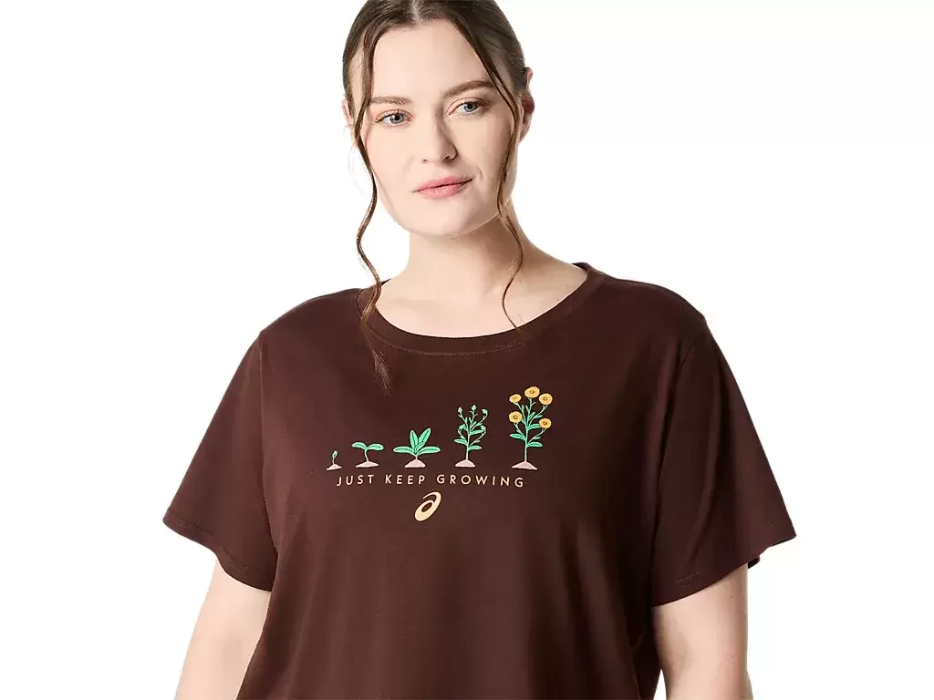 Denne komfortable strikkede kortermede t-skjorten har en rekke plantegrafikk på forskjellige stadier av vekstsyklusen deres på forsiden. Den har også uttrykket «JUST KEE GROWING» skrevet under.