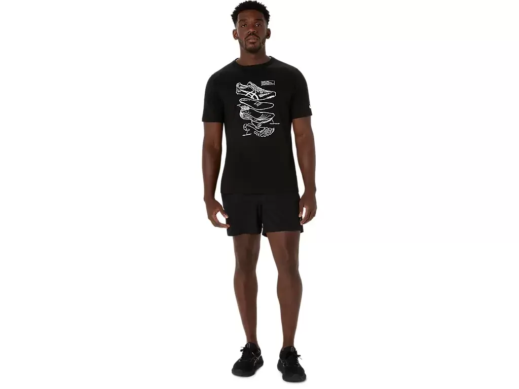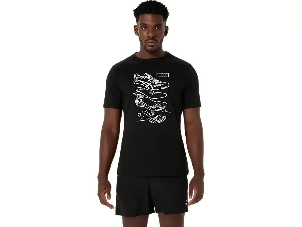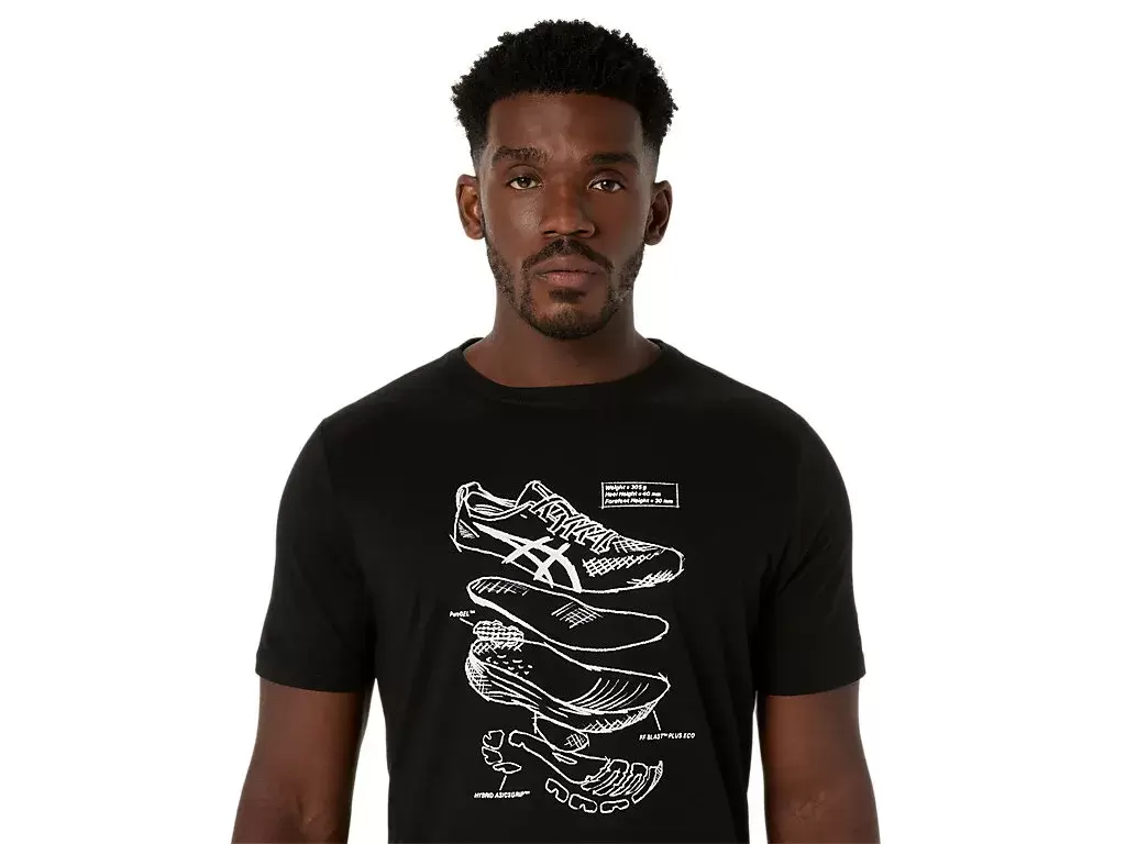 Denne komfortable strikkede kortermede t-skjorten er inspirert av skisser av ASICS løpesko. Den er stemplet med en grafikk foran som viser de ulike komponentene som brukes til å bygge løpeskoene våre.