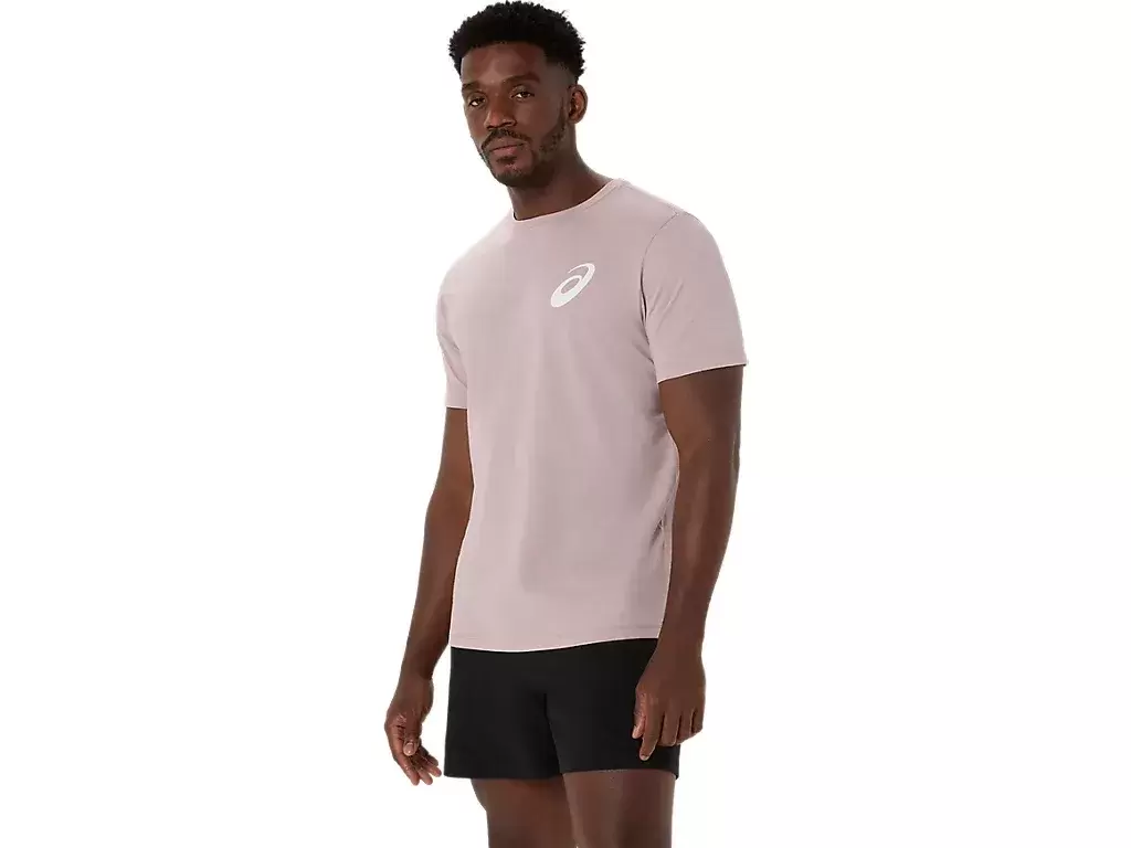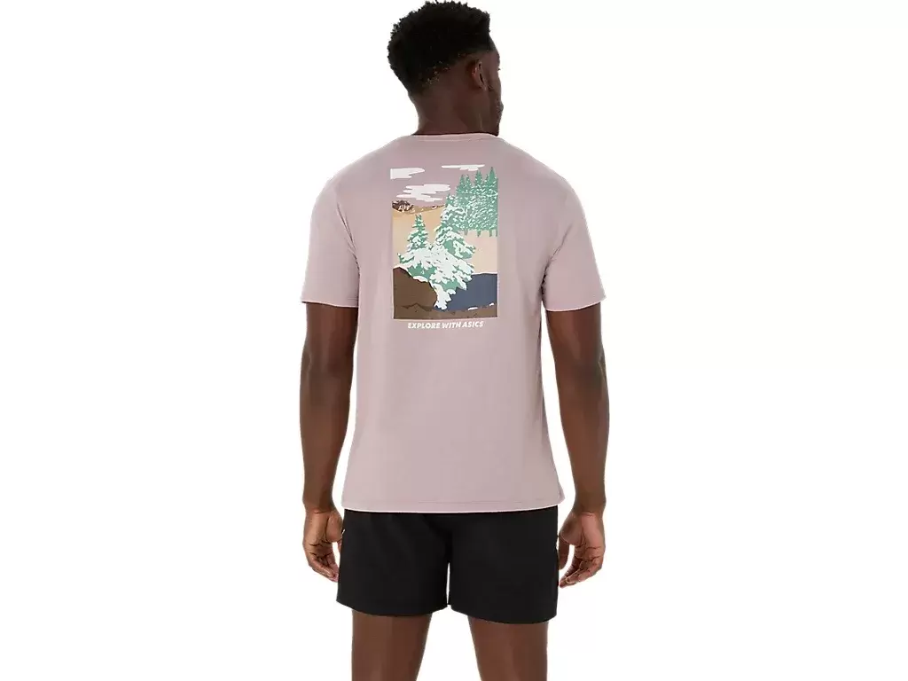 Denne komfortable strikkede kortermede t-skjorten er inspirert av naturscener. Den har en rolig skoggrafikk som møtes med uttrykket «UTFORSK MED ASICS» på brystet.