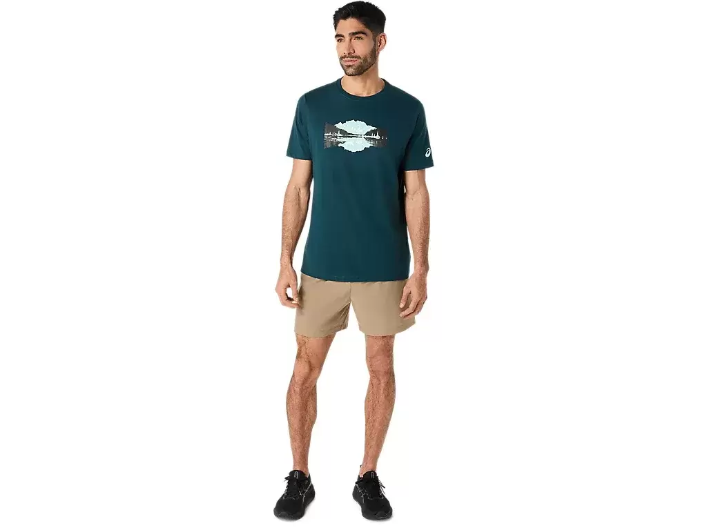 Denne komfortable strikkede kortermede t-skjorten er inspirert av naturen. Grafikken foran har et design av en fredelig innsjø med fjelltopper i det fjerne.
