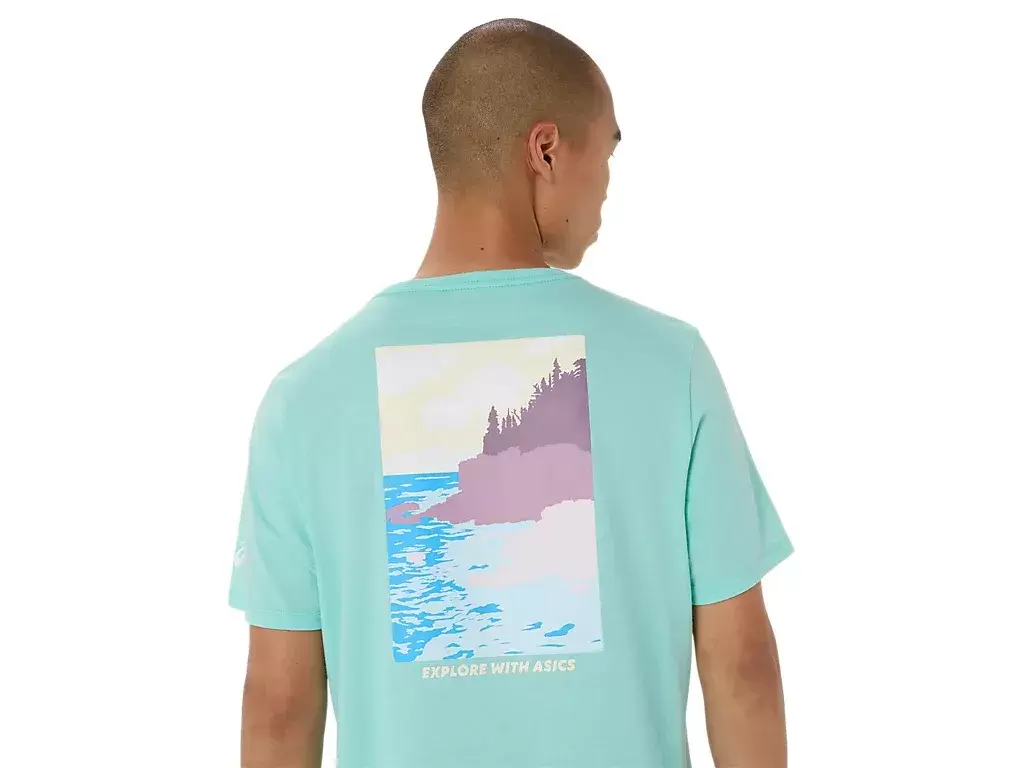 Denne komfortable strikkede kortermede t-skjorten er inspirert av naturskjønne sjølandskap. Grafikken på ryggen har uttrykket «UTFORSK MED ASICS», som komplementeres av et kystnært trekantet design.