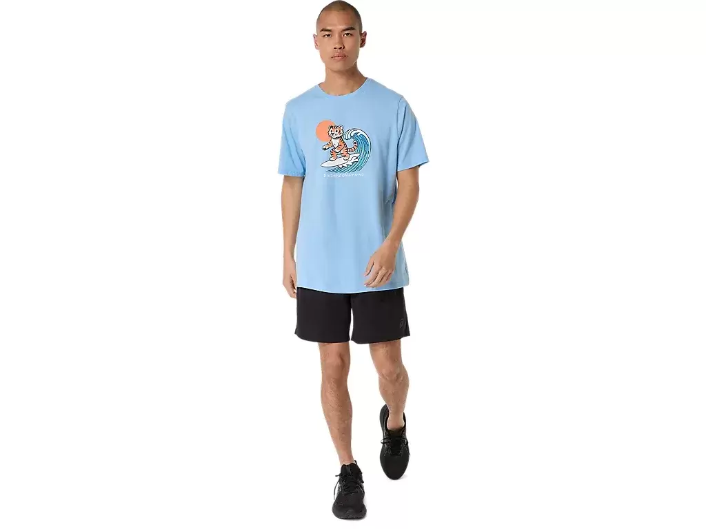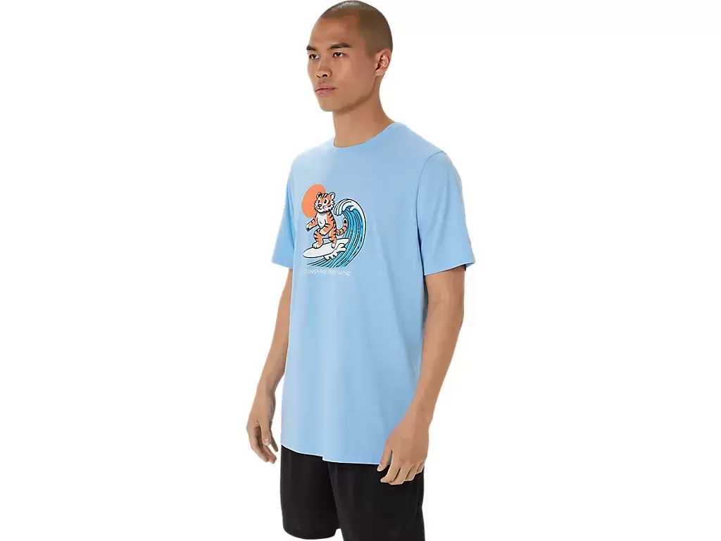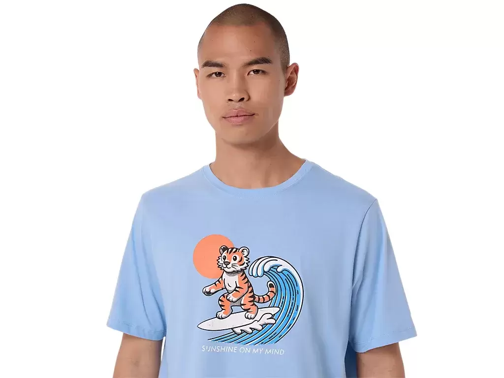 Denne komfortable strikkede kortermede t-skjorten er inspirert av stranden. Grafikken foran viser en tiger som surfer, mens uttrykket «SUNSHINE ON MY MIND» vises under.