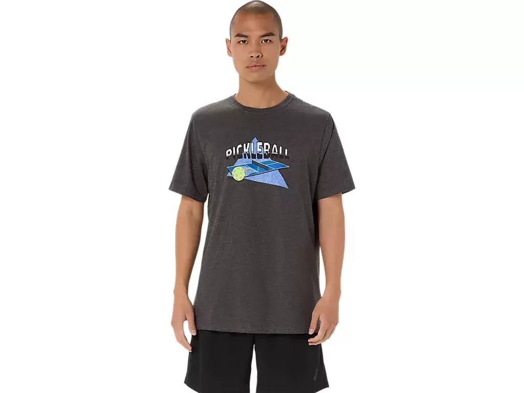 Denne komfortable strikkede kortermede t-skjorten er inspirert av pickleball. Den har en pickleball-grafikk som er gjengitt med kunstverk som minner om arkadespill og uttrykket «Dink Responsibly» på brystet.